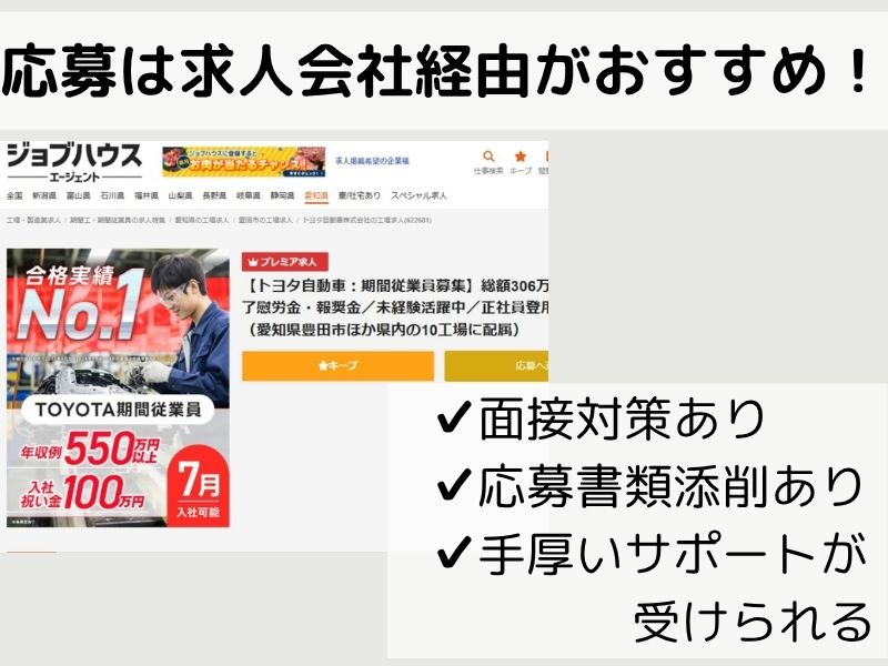 また、ジョブハウスを利用すれば、トヨタ期間工の面接対策や、履歴書添削など手厚いサポートが受けられ、また不安なことも相談ができるメリットがあります。