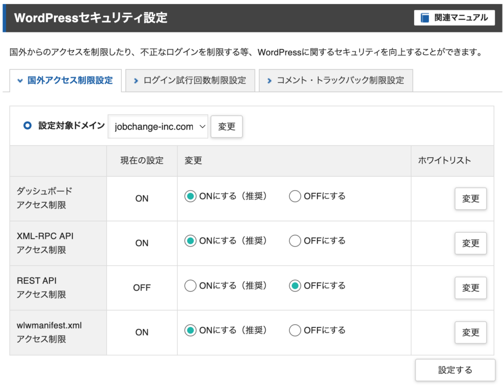 具体的には「WordPressセキュリティ設定」の「国外アクセス制限設定」の「REST APIアクセス制限」をOFFにすることで問題が解消されます。